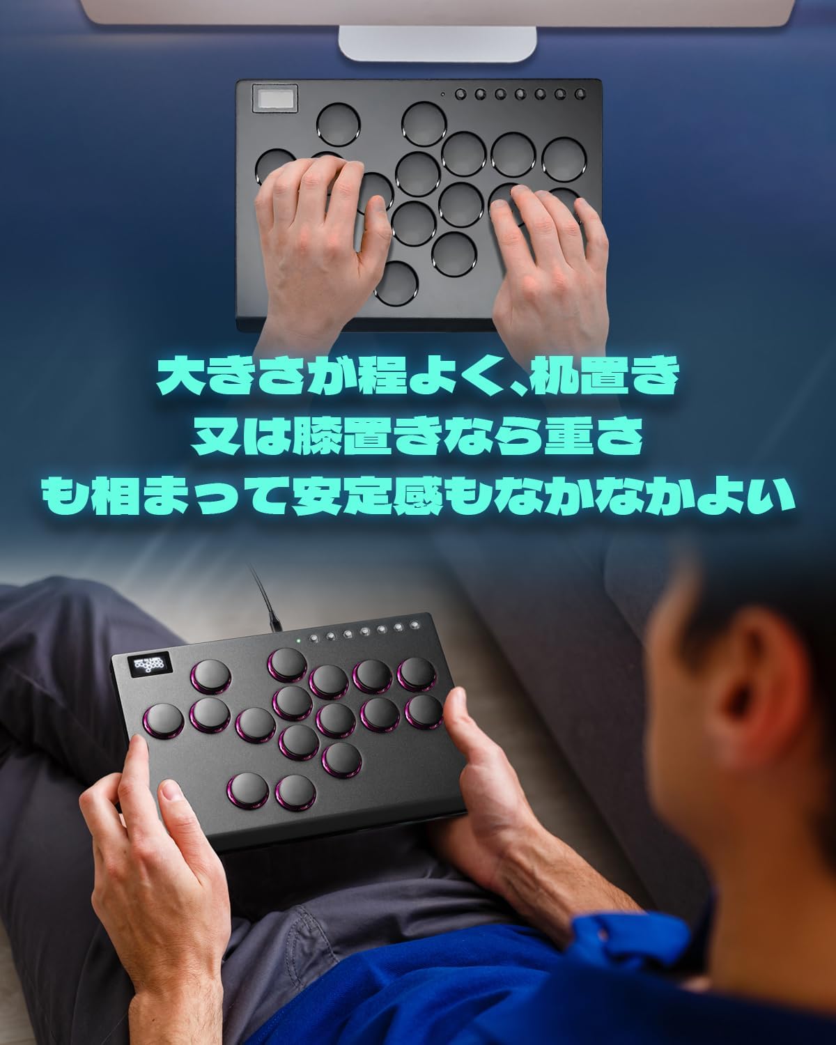 1.【本社最上位モデル& ロープロファイル16ボタン仕様のレバーレスアケコン】 スティックの操作による入力ミスや無駄を一切排除し、指先全体を使ったタイピング方式のコマンド入力に変換することで、コマンド入力の正確性をより早く高められると、話題のレバーレスコントローラー。高級な質感やスペックとポテンシャルと共に申し分ない性能です。ボタンの剛性は中々のモノで、乱暴に扱ってもボタンが外れる事は無かった。本体デザインはアルミパネルでできていて、重厚感があるし、LEDライトによる装飾もあり格好いいです。基盤・システムにpico GP2040-CEを利用しており安心して長時間にお使い頂けます、体感では遅延が全く感じられなく、不具合修正などのファームウェア更新が可能です。対応機種:Windows 10以降/ Steam Deck/PS3/PS4/Switch/Raspberry Pi(Lakka、RetroPie、Recalbox、Batocera)/MiSTer/Android、Linux、iPadOS、macOS.