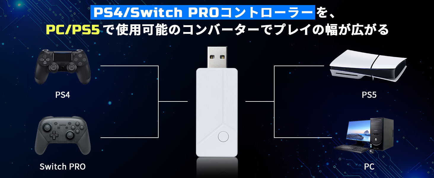1.「多機種コントローラー対応&多機器接続可能」 PS4コントローラーやSwitch PROコントローラーを、PS5本体やPCで直接使用可能にするコンバーターです。