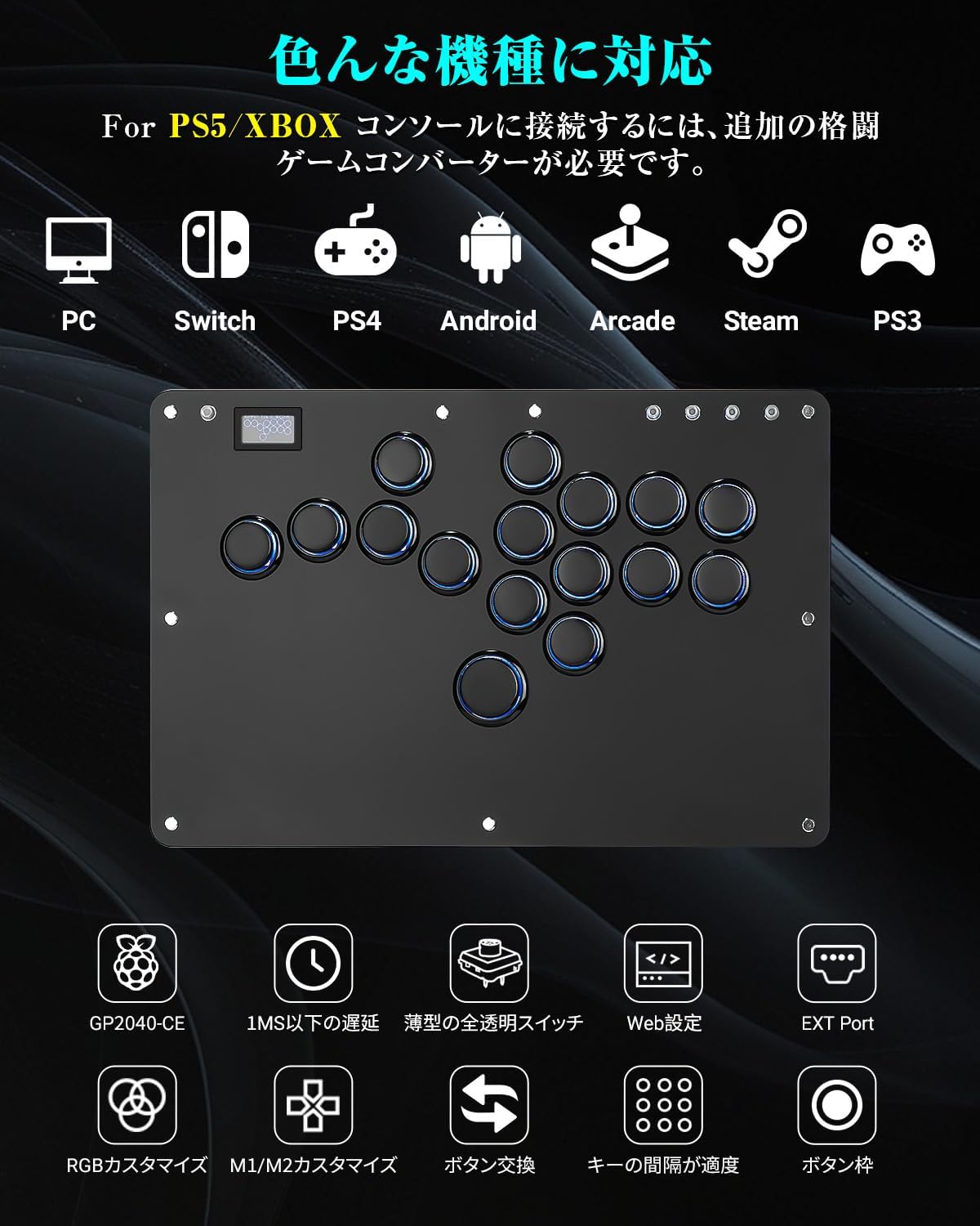 2、【対応機種】操作レバーはタイピングモードにも切り替え可能で、入力ミスを減らし、操作の正確性とスピードを大幅に向上させます。システムにはpico GP2040-CEを搭載しており、ファームウェアのアップデートにも対応しています。対応機種は、Windows 10以降、Steam Deck、PS3、PS4、Switch、Raspberry Pi(Lakka、RetroPie、Recalbox、Batocera)、MiSTer、Android、Linux、iPadOS、macOSなど。