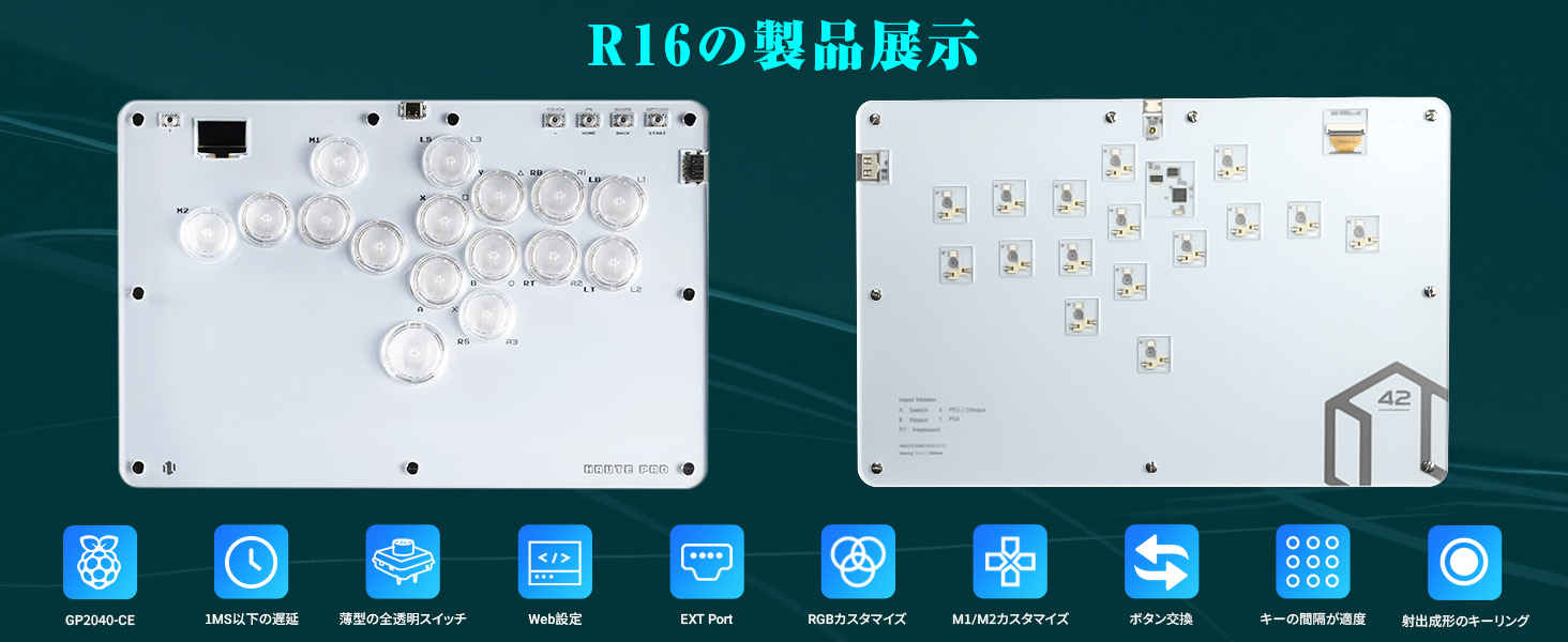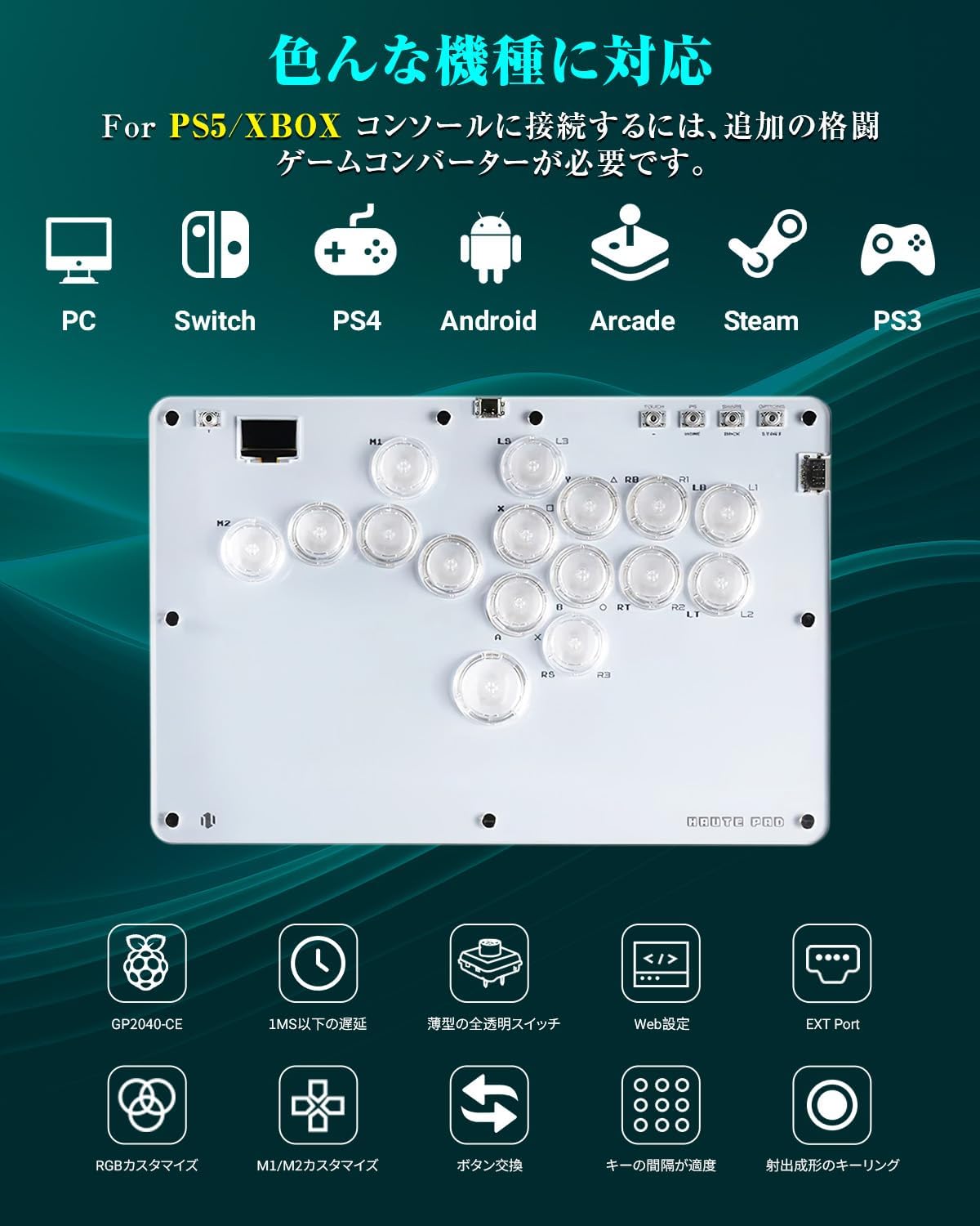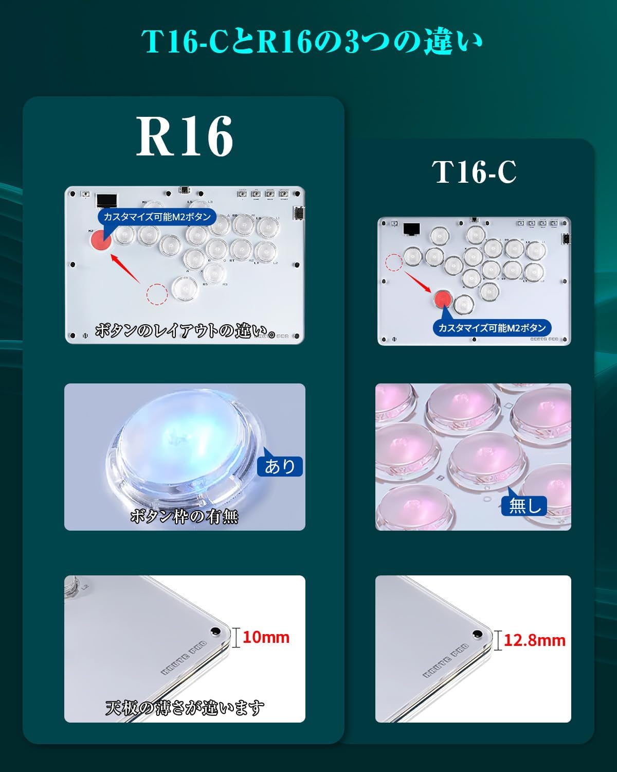 1.【格ゲー向けのレバーレスアケコンR16白】T16-Cと比べてボタンのレイアウトが変わった。珍しくḾ2ボタンが左手の小指に移動しているので、小指の使い方に慣れている方は小指で使えるM2ボタンの機能をカスタマイズすることも可能です。本体配色が綺麗だし、ボタン枠の追加でしっかりした感触でありながら、使いやすいです。ボタンが引っかかっていたり、外れたりせず、ちょうどいいサイズで運指がしやすい。天板広め、極薄の厚さ、携帯便利とKailh高透明ロープロファイルのキースイッチを搭載し、LEDライトがかなり明るい。コマンド入力でのジャンプ等への誤爆が一切なくなり、従来のアーケードスティックより素早く正確な操作が可能で、格闘ゲームの技もやすく出せます。システムが pico GP2040-CE、不具合修正などのファームウェア更新が可能。対応機種:Windows 10以降/ Steam Deck/PS3/PS4/Switch/Raspberry Pi(Lakka、RetroPie、Recalbox、Batocera)/MiSTer/Android、Linux、iPadOS、macOS. PS5やXBOXに接続する際は、専用の格ゲーコンバーターが必要です、互換性を確保するために、ぜひ別途にご購入ください。弊社では、PS4/PS5に対応したBooter5コンバーターと、XBOX用のBrook Wingman FGCを取り扱っています。