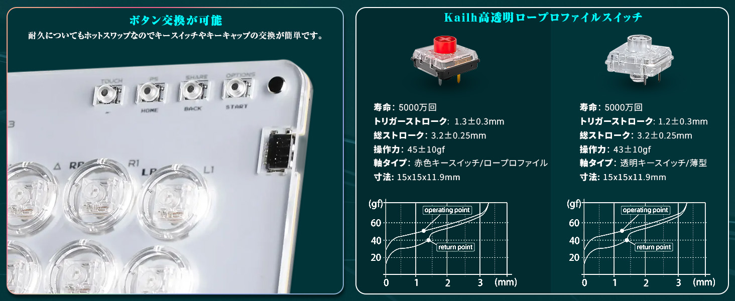 4.【キースイッチ交換可能&RGB カスタマイズ】 RGB照明効果を備えた透明なアクリル素材で、当店ではこの製品の天板カスタマイズ用テンプレートとカスタマイズ方法をご提供出来るので、お好みのイラストを入れてDIY可能です。発光パターンは4種類、配色は概ね好きな色に設定でき、ボタンを押した時だけ別の色に光らせることも可能です。高品質のKailh ロープロファイルキースイッチを付いてますが、ホットスワップ対応で、本体の開閉が不要で、易くキースイッチを交換してカスタマイズ可能なので、スイッチの摩耗を気にしなくてもいい。