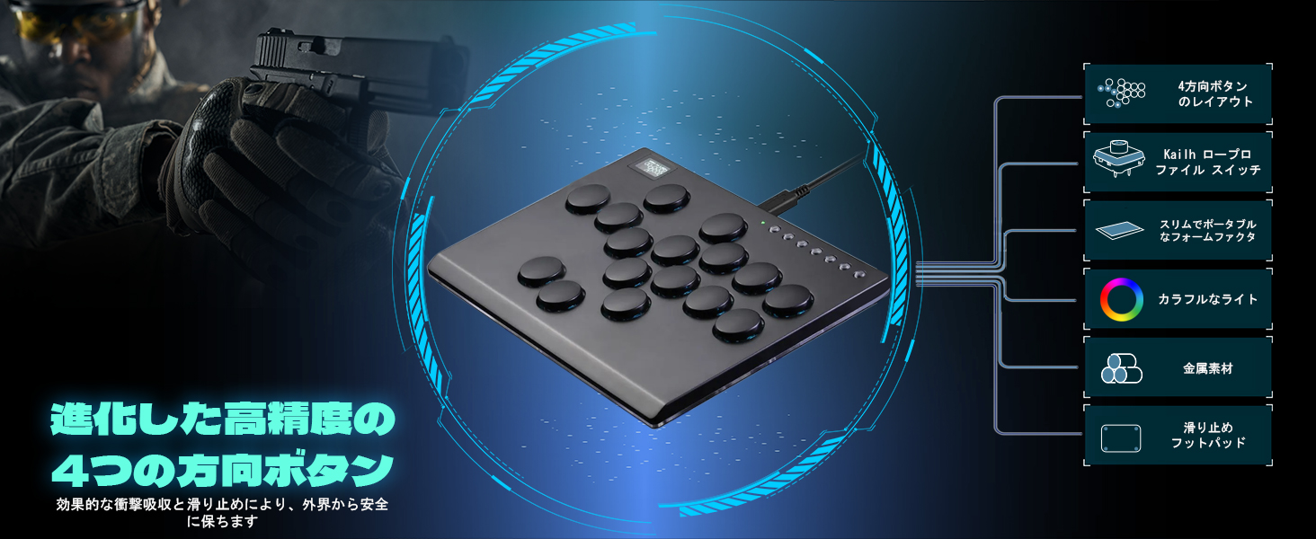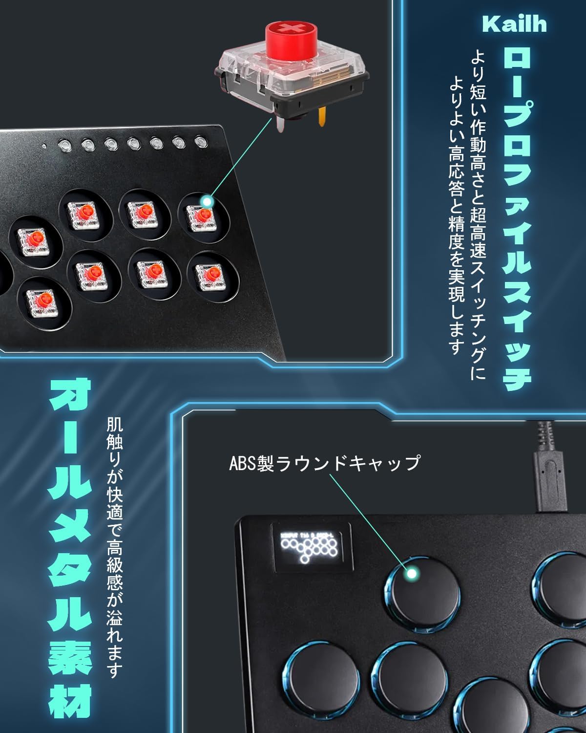 3、【最速、高応答】 入力遅延が 1 ms 未満のオーバークロックされたポーリング レート、新テクノロジーとオールボタンデザインが採用され、ストローク・アクチュエーションポイントが大幅に短くなりました。Kailh ロープロボタンを採用して、コマンド入力や間合いの管理がレバーよりもすばやく正確にできるので、とくに格闘ゲームプレイヤーに向いています。