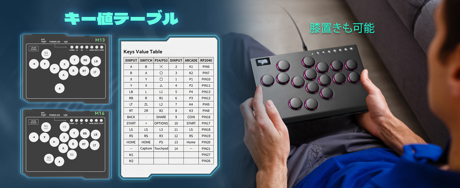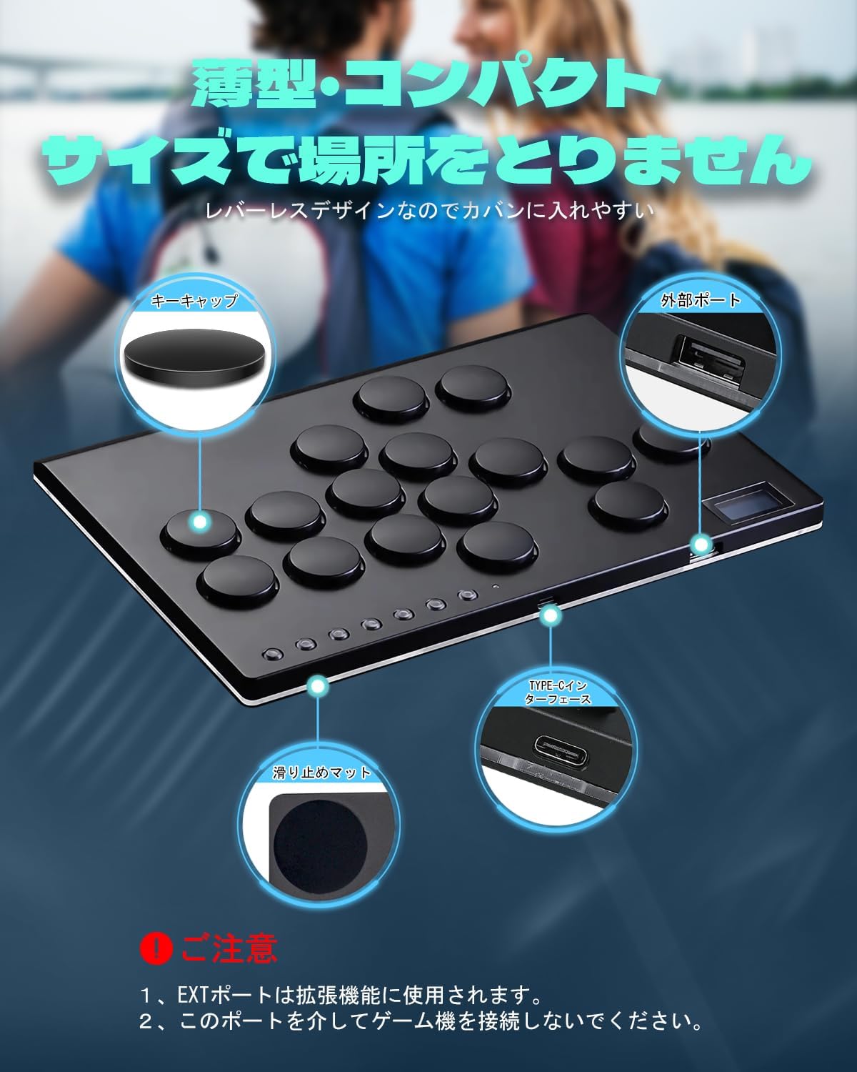 1.【本社最上位モデル& ロープロファイル16ボタン仕様のレバーレスアケコン】 スティックの操作による入力ミスや無駄を一切排除し、指先全体を使ったタイピング方式のコマンド入力に変換することで、コマンド入力の正確性をより早く高められると、話題のレバーレスコントローラー。高級な質感やスペックとポテンシャルと共に申し分ない性能です。ボタンの剛性は中々のモノで、乱暴に扱ってもボタンが外れる事は無かった。本体デザインはアルミパネルでできていて、重厚感があるし、LEDライトによる装飾もあり格好いいです。基盤・システムにpico GP2040-CEを利用しており安心して長時間にお使い頂けます、体感では遅延が全く感じられなく、不具合修正などのファームウェア更新が可能です。対応機種:Windows 10以降/ Steam Deck/PS3/PS4/Switch/Raspberry Pi(Lakka、RetroPie、Recalbox、Batocera)/MiSTer/Android、Linux、iPadOS、macOS.