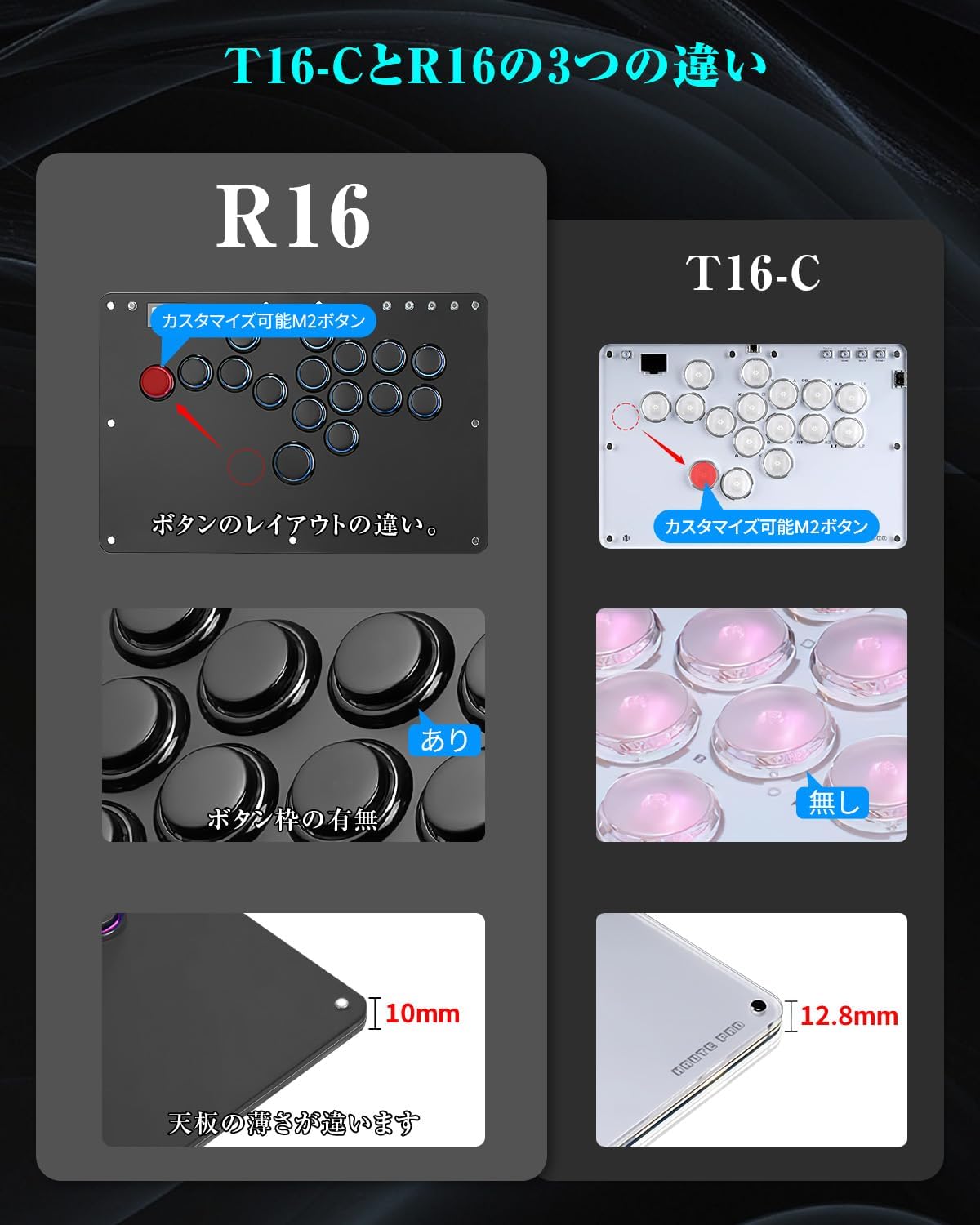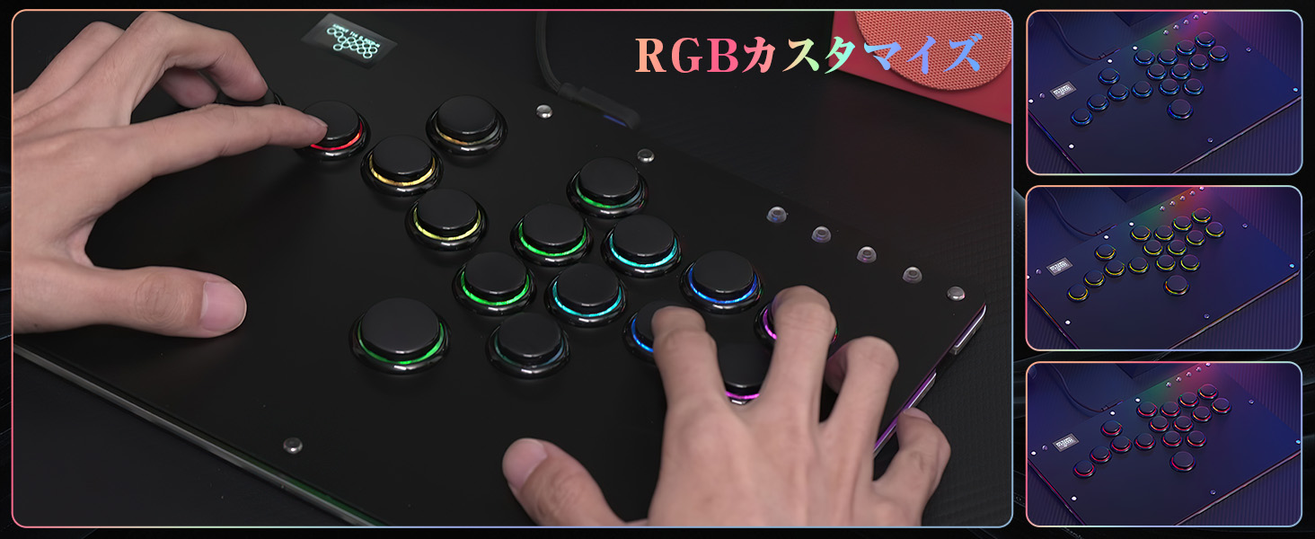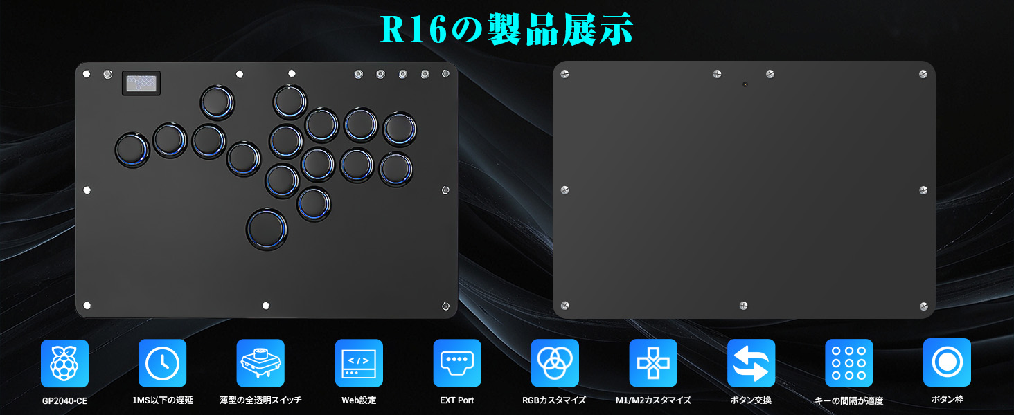 1.【格ゲー向けのレバーレスアケコンR16ブラック】 市販品と比べてボタンのレイアウトが変わった。業界でも珍しくM2ボタンが左の小指に移動、小指に慣れている方には、M2ボタンの機能を自分好みにカスタマイズ可能、超便利。ボタン枠の追加でしっかりした感触、操作性が向上しボタンが引っかからず外れにくくなり、適度なサイズで運指がしやすい。 Kailh製の高透明ロープロファイルスイッチを採用し、操作感が勿論、LEDライトも明るくて、視覚的にも楽しめます。天板広め、極薄の厚さ、手頃な本体サイズを備え、膝置き、机置き両方でも安定、持ち運びにも超便利。