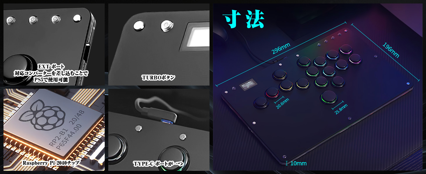 2、【対応機種】操作レバーはタイピングモードにも切り替え可能で、入力ミスを減らし、操作の正確性とスピードを大幅に向上させます。システムにはpico GP2040-CEを搭載しており、ファームウェアのアップデートにも対応しています。対応機種は、Windows 10以降、Steam Deck、PS3、PS4、Switch、Raspberry Pi(Lakka、RetroPie、Recalbox、Batocera)、MiSTer、Android、Linux、iPadOS、macOSなど。