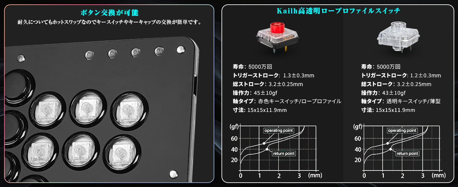 3、【for PS4/PS5との接続ご注意喚起】 PS4/PS5本体の接続については、公式サイトまたは取扱説明書をご参照のうえ、設定を行ってください。日本語の取扱説明書や、公式サポートサイト(haute42.com/supports/)のリンク先をよくお読みいただき、設定方法をご確認ください。本製品はPS5本体でPS4ゲームのプレイに対応していますが、PS5ゲームをプレイするためには、別売りのアケコンコンバーターが必要となりますのでご注意ください。 M1とM2は同様の機能を持つ仕様、192.168.7.1のWebプラウザで、キー機能を変更出来ます。耐久についてもホットスワップなのでキースイッチやキーキャップの交換が簡単です。もし、キーキャップが外れるや自然磨耗の場合は、弊店までご連絡して、キースイッチやキーキャップの交換を無料で手配いたします。