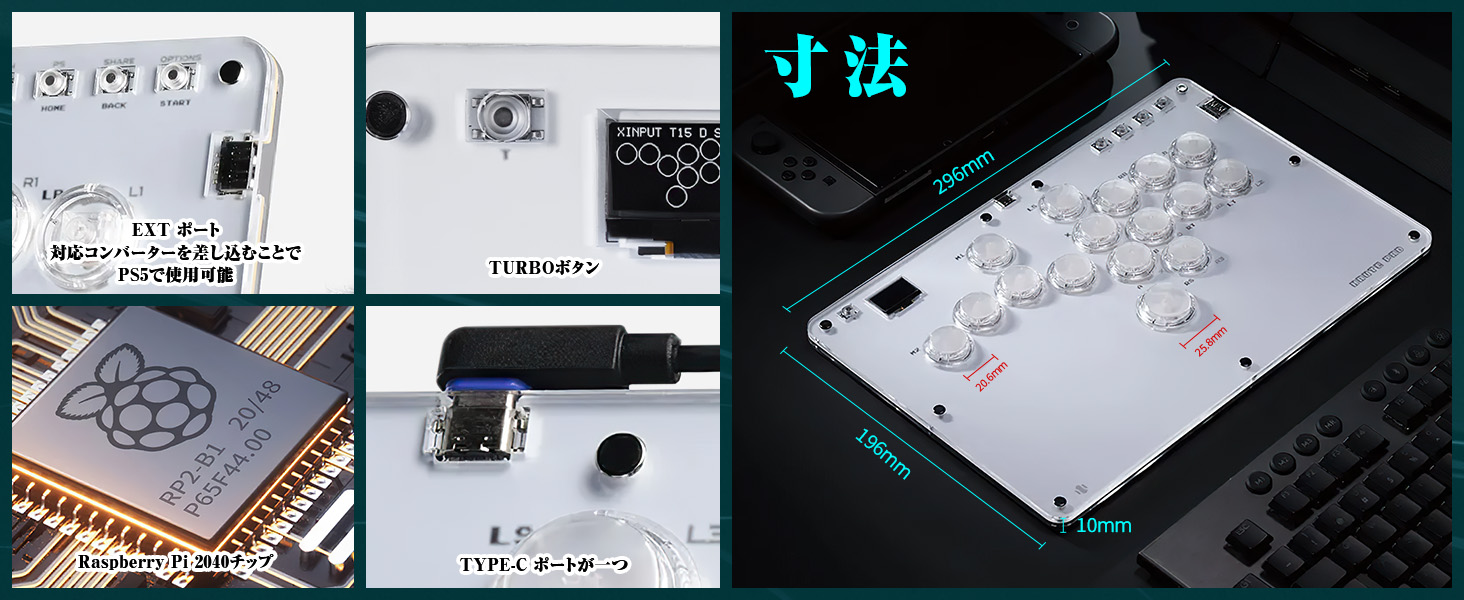 1.【格ゲー向けのレバーレスアケコンR16白】T16-Cと比べてボタンのレイアウトが変わった。珍しくḾ2ボタンが左手の小指に移動しているので、小指の使い方に慣れている方は小指で使えるM2ボタンの機能をカスタマイズすることも可能です。本体配色が綺麗だし、ボタン枠の追加でしっかりした感触でありながら、使いやすいです。ボタンが引っかかっていたり、外れたりせず、ちょうどいいサイズで運指がしやすい。天板広め、極薄の厚さ、携帯便利とKailh高透明ロープロファイルのキースイッチを搭載し、LEDライトがかなり明るい。コマンド入力でのジャンプ等への誤爆が一切なくなり、従来のアーケードスティックより素早く正確な操作が可能で、格闘ゲームの技もやすく出せます。システムが pico GP2040-CE、不具合修正などのファームウェア更新が可能。対応機種:Windows 10以降/ Steam Deck/PS3/PS4/Switch/Raspberry Pi(Lakka、RetroPie、Recalbox、Batocera)/MiSTer/Android、Linux、iPadOS、macOS. PS5やXBOXに接続する際は、専用の格ゲーコンバーターが必要です、互換性を確保するために、ぜひ別途にご購入ください。弊社では、PS4/PS5に対応したBooter5コンバーターと、XBOX用のBrook Wingman FGCを取り扱っています。